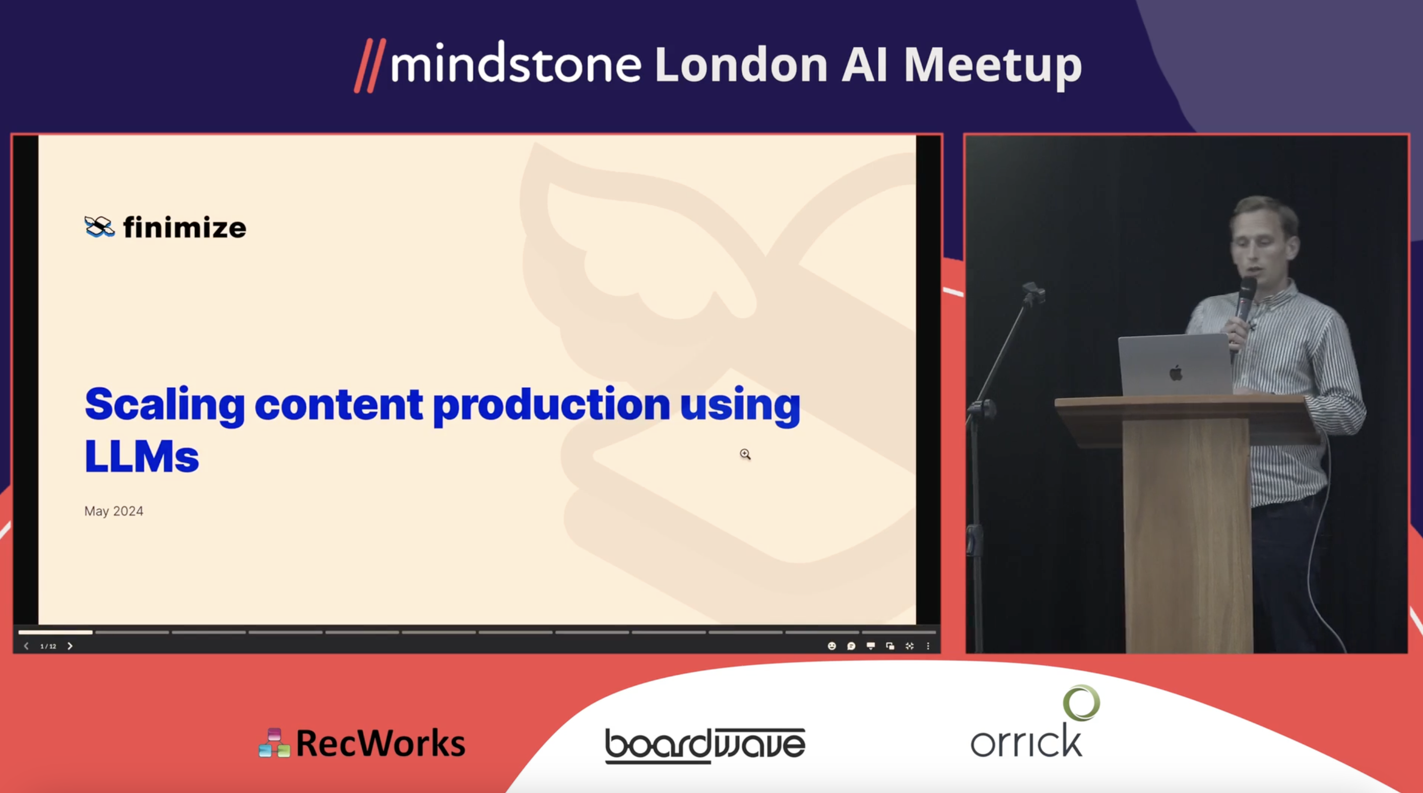 Hi everyone, I'm Matt, I'm the VP of Engineering at Finamize and as Josh said I'll be talking about scaling content production using LLMs and how we've done that in-house.