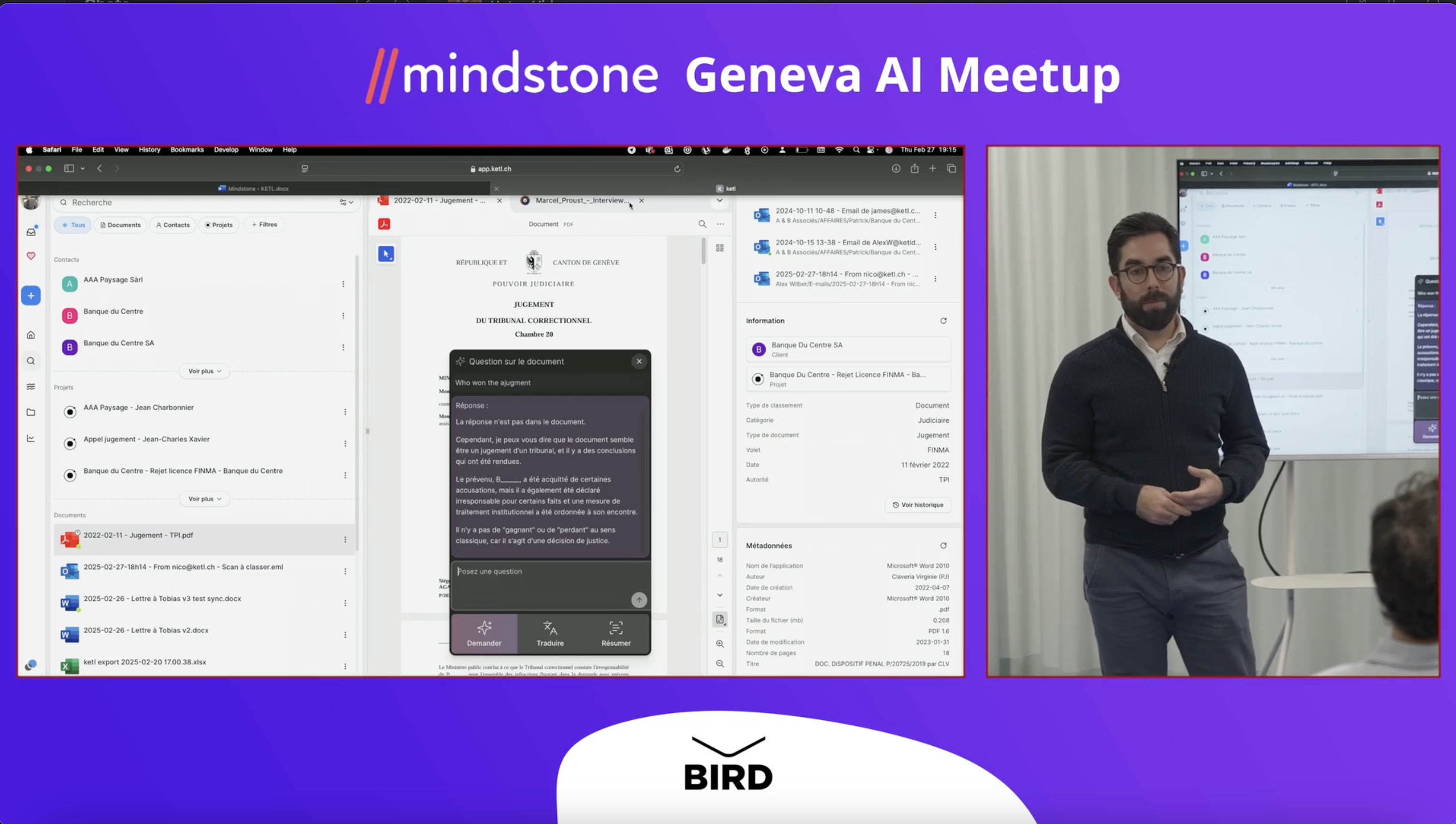 And so you can find here that the judgment is stored in the right place that I showed before. with a name that's correctly put, so the date is as the first part of the file name, you have the type of document, and the actual tribunal that's mentioned in the document. In here you have all the information you need to work on the document, so everything that's extracted is over there and everything else. So that's where we started. And then LLM happened, and we said, okay, so what can we do with LLMs? And that's where you can see we went with the nice intelligence logo and said, okay, so now, oh, it's in French, whatever.
