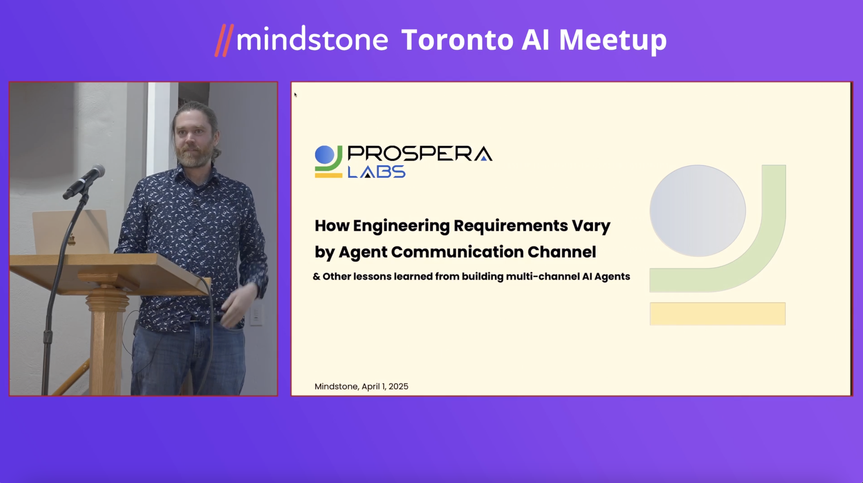 So my talk today is about how the different communication channels that an agent communicates on impacts the engineering and the requirements from the engineering. We at Prospera Labs, we make specifically conversational agents, like we're not making the kind of AI agent that just goes off on its own and autonomously does a bunch of stuff.