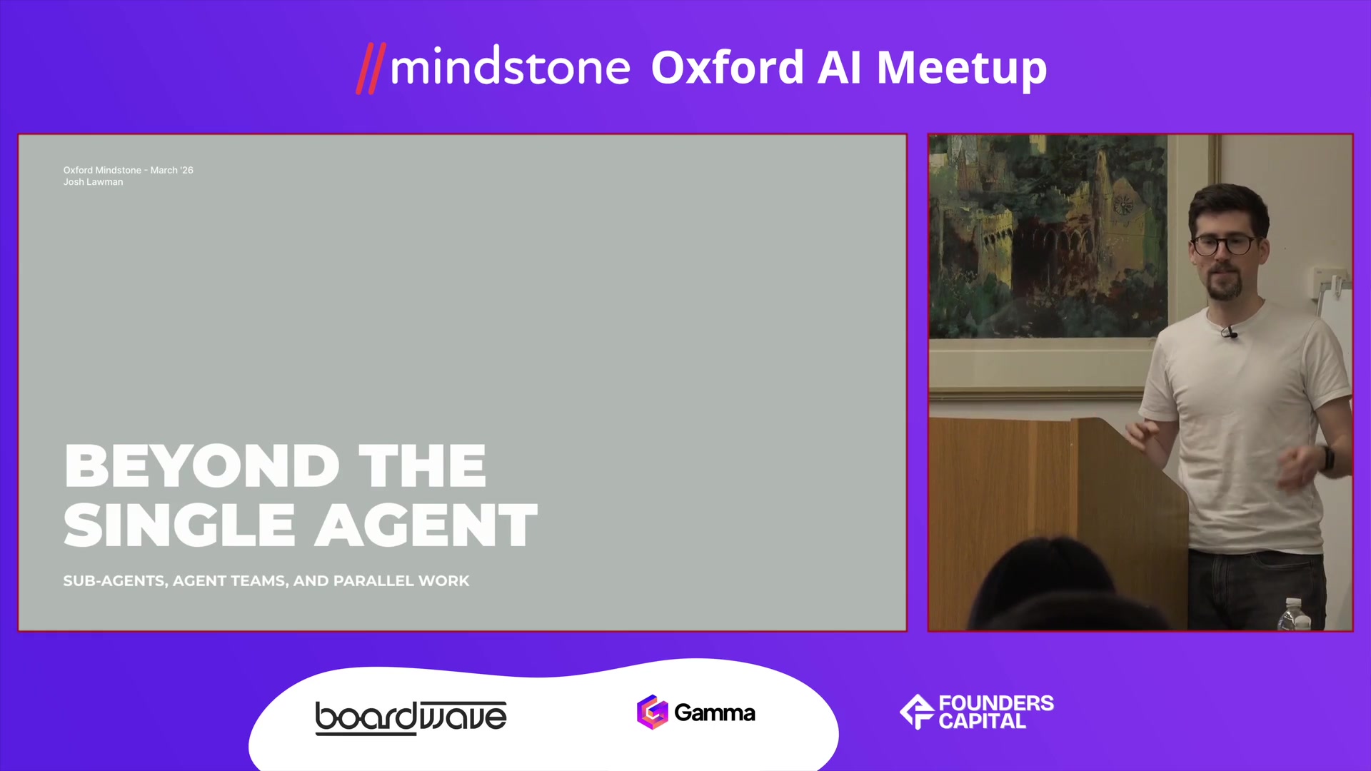 Hi everyone, I'm Josh, and I'm going to be talking about working with multiple agents, so mostly trying to outline a problem that I think we've all faced, and then ways of thinking through the solution that is still emerging. For my work, I build generative AI products for clients and help people using agentic coding tools.